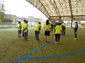 今回は〝キンボール〟というスポーツをしました。準備でボールに空気を入れる際、ボールが破裂してしまうというハプニングがありましたが、何とかボールを修復する事ができ、無事実施する事ができました。